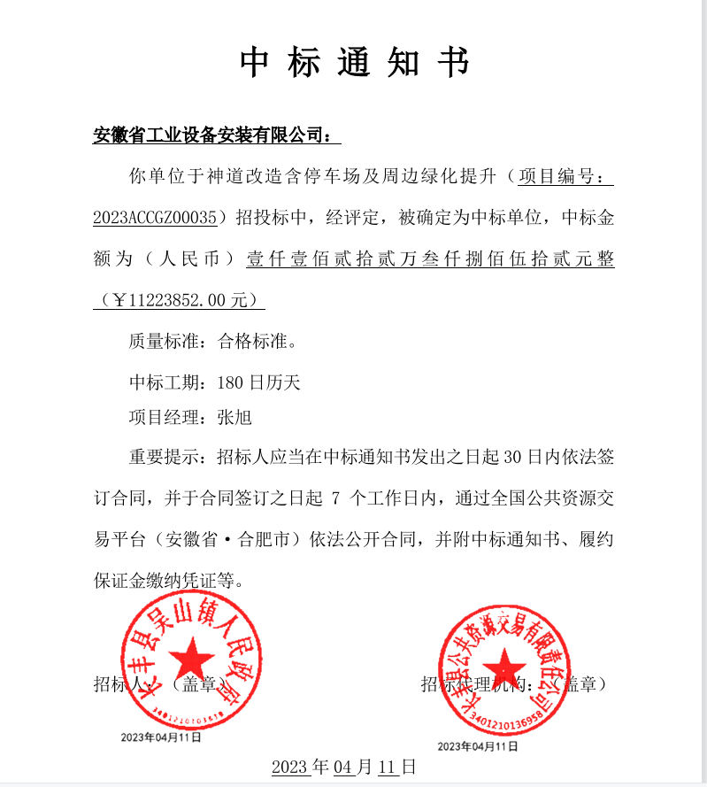 4月11日,安徽安裝市政分公司在合肥市公共資源交易平臺上投標(biāo)長豐縣吳山鎮(zhèn)神道改造含停車場及周邊綠化提升項(xiàng)目并一舉中標(biāo),中標(biāo)金額1122.38萬元。這次公招中標(biāo)是分公司繼2022年8月12日廬江立人路項(xiàng)目中標(biāo)后第二次在合肥市公招市場中標(biāo)的市政類項(xiàng)目。