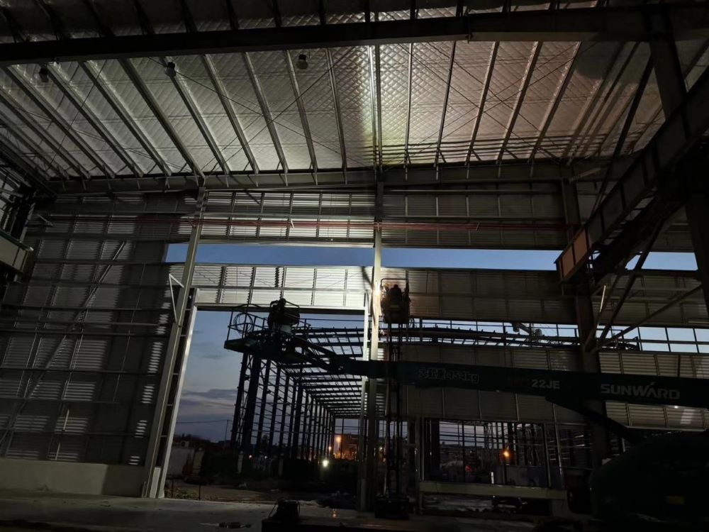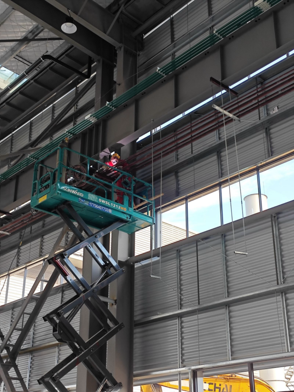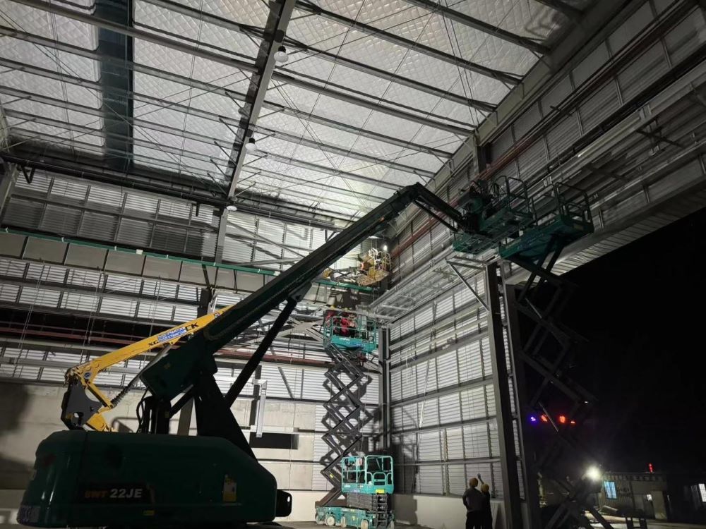 建工安裝合肥分公司施工內(nèi)容涉及2#重鋼車間主次構(gòu)安裝、圍護(hù)系統(tǒng)、門窗、防火涂料、通風(fēng)氣樓和機(jī)電安裝工程(裝飾裝修、工藝管線、消防、給排水、電氣、通風(fēng)空調(diào)等)。為保質(zhì)保量完成施工任務(wù),分公司派駐分管領(lǐng)導(dǎo)現(xiàn)場駐點,項目管理團(tuán)隊日夜跟進(jìn),施工人數(shù)達(dá)到100多人,曲臂車、登高車等各種現(xiàn)場施工機(jī)械達(dá)60余輛。本項目留給機(jī)電安裝工期緊任務(wù)重,項目全體人員日夜奮戰(zhàn),最終刷新15日大面完工耀眼戰(zhàn)績,為基地順利投產(chǎn)奠定堅實基礎(chǔ)。