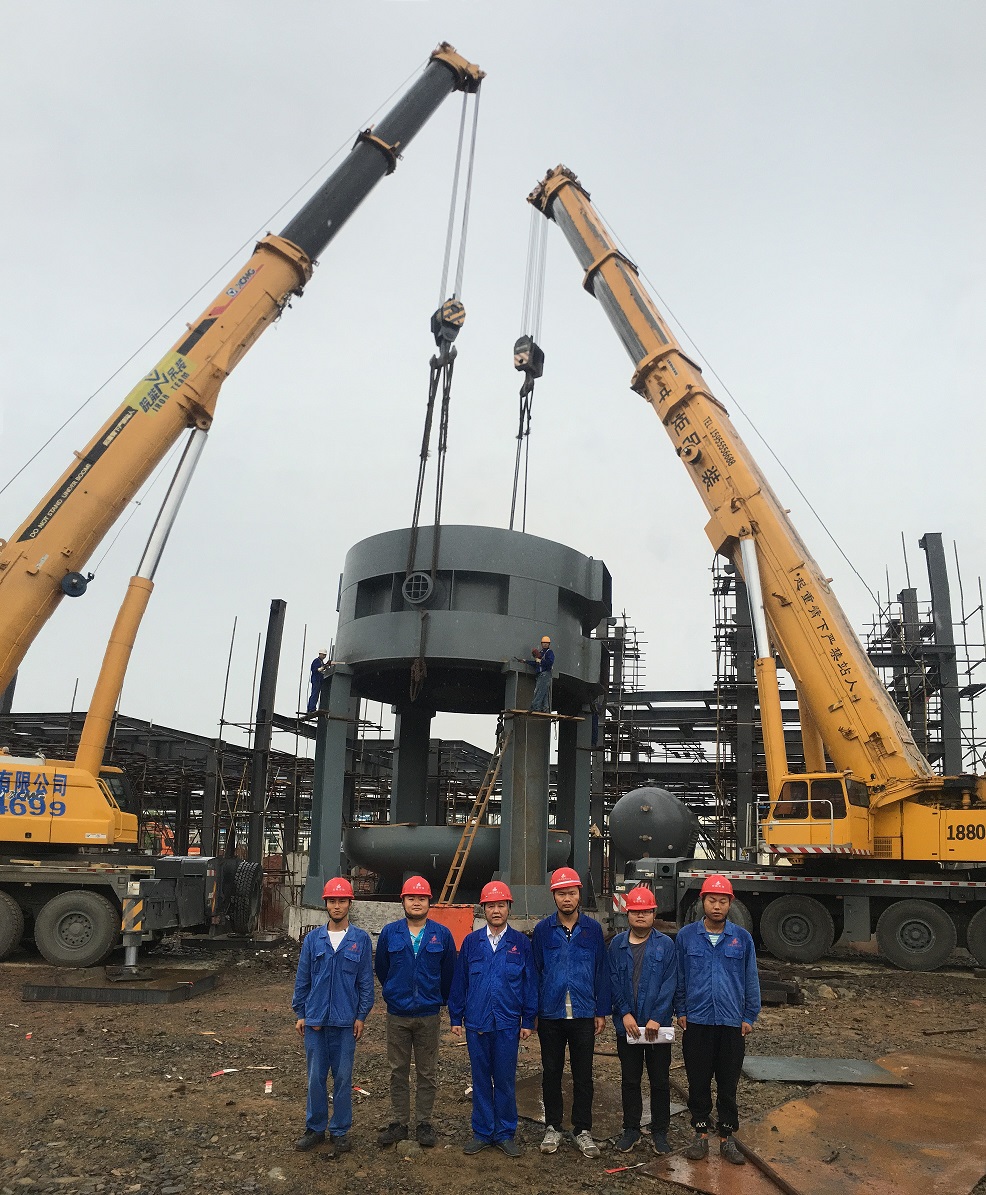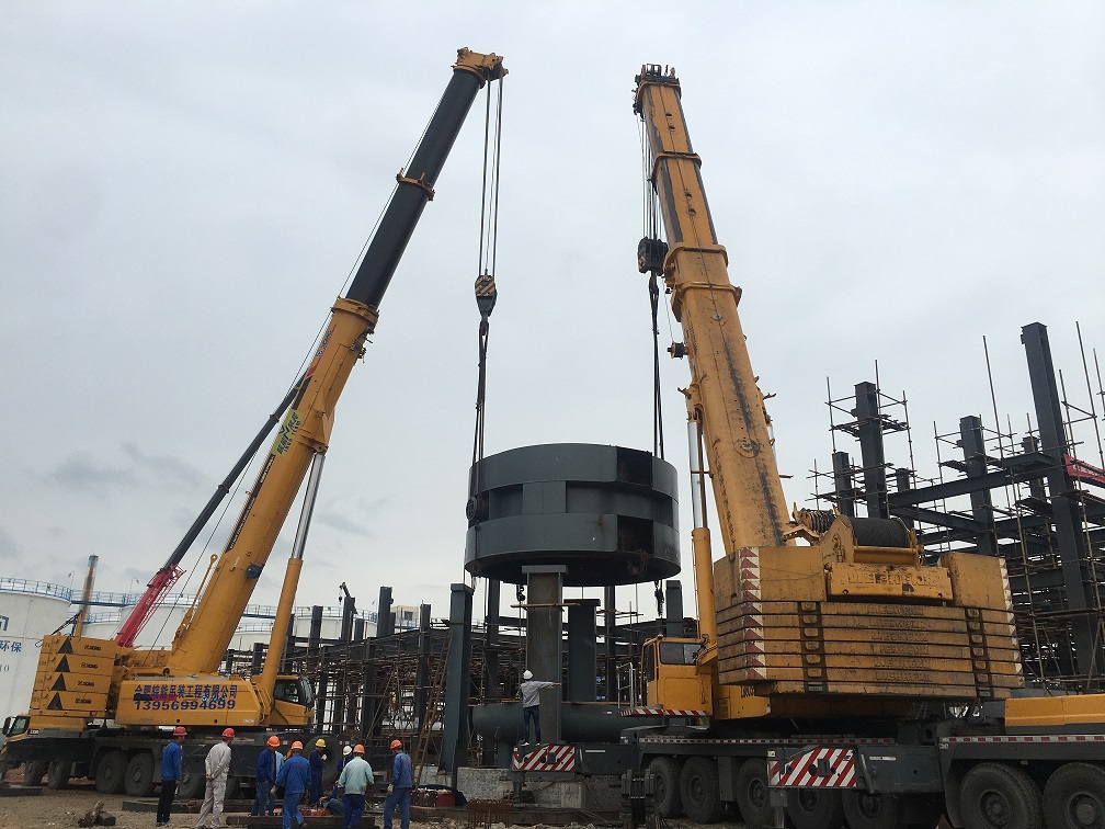 本次吊裝的反應(yīng)器中段部分重達(dá)220噸,分公司領(lǐng)導(dǎo)高度重視,吊裝前期,邀請公司總工吳繼成、總工辦主任牛守義和安全部王岳濤經(jīng)理親臨項目部參與設(shè)備吊裝的專題方案討論定稿工作。當(dāng)日上午,吊裝現(xiàn)場準(zhǔn)備工作緊張卻又有條不紊的進(jìn)行,項目經(jīng)理李子鳳向全體“參戰(zhàn)”員工進(jìn)行了安全交底,工作人員對兩臺分別為500T、350T吊車的站位及性能再次確認(rèn),現(xiàn)場機(jī)具、人員均按既定方案實施。分公司經(jīng)理史崇松、業(yè)主單位負(fù)責(zé)人、監(jiān)理全程在現(xiàn)場“督戰(zhàn)”,全體工作人員經(jīng)過四個小時的奮戰(zhàn),吊裝作業(yè)圓滿結(jié)束。