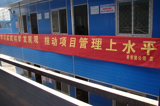 省政務(wù)服務(wù)中心及綜合樓和合肥中心醫(yī)院項(xiàng)目屬省、市重點(diǎn)工程之一。由多家大中型施工企業(yè)共同承建。我公司承擔(dān)的安裝工作量分別在1582萬(wàn)和2800萬(wàn)以上,是具有相當(dāng)規(guī)模和社會(huì)影響的工程項(xiàng)目。合肥項(xiàng)目黨支部在開展第二批實(shí)踐科學(xué)發(fā)展觀活動(dòng)中,因地制宜地開展宣傳活動(dòng)。分別在這兩個(gè)項(xiàng)目施工現(xiàn)場(chǎng)懸掛了《深入開展學(xué)習(xí)實(shí)踐科學(xué)發(fā)展觀活動(dòng)》和《學(xué)習(xí)實(shí)踐科學(xué)發(fā)展觀推動(dòng)項(xiàng)目管理上水平》的橫幅標(biāo)語(yǔ)。目前是整個(gè)施工現(xiàn)場(chǎng)開展學(xué)習(xí)實(shí)踐科學(xué)發(fā)展觀活動(dòng)中唯一在現(xiàn)場(chǎng)宣傳的一家施工企業(yè)。