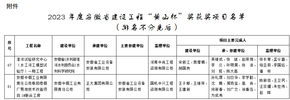 7月25日,安徽省住房和城鄉(xiāng)建設(shè)廳 、安徽省交通運(yùn)輸廳、安徽省水利廳聯(lián)合發(fā)布《關(guān)于公布2023年度安徽省建設(shè)工程“黃山杯”獎(jiǎng)獲獎(jiǎng)項(xiàng)目名單的通知》,由建工安裝集團(tuán)蚌埠分公司承建的“淮河試驗(yàn)研究中心(水工河工模型試驗(yàn)廳)一期工程”和參建的“安徽中煙工業(yè)有限責(zé)任公司阜陽(yáng)卷煙廠易地技術(shù)改造項(xiàng)目1#聯(lián)合工房”等2個(gè)項(xiàng)目均獲2023年度安徽省建筑行業(yè)建設(shè)工程質(zhì)量最高榮譽(yù)獎(jiǎng)“黃山杯”。其中“淮河試驗(yàn)研究中心(水工河工模型試驗(yàn)廳)一期工程”是建工安裝公司首次作為承建單位獲此殊榮;“安徽中煙工業(yè)有限責(zé)任公司阜陽(yáng)卷煙廠易地技術(shù)改造項(xiàng)目1#聯(lián)合工房”項(xiàng)目同時(shí)正在申報(bào)國(guó)家級(jí)安裝行業(yè)最高獎(jiǎng)項(xiàng)中國(guó)安裝工程優(yōu)質(zhì)獎(jiǎng)(安裝之星),5月份預(yù)檢已通過,等待9月復(fù)檢。兩個(gè)項(xiàng)目作為承建和參建單位一舉捧得2樽“黃山杯”,也是蚌埠分公司歷史首次,同時(shí)也是蚌埠分公司近年來(lái)捧得的第5、第6樽“黃山杯”獎(jiǎng)項(xiàng)。