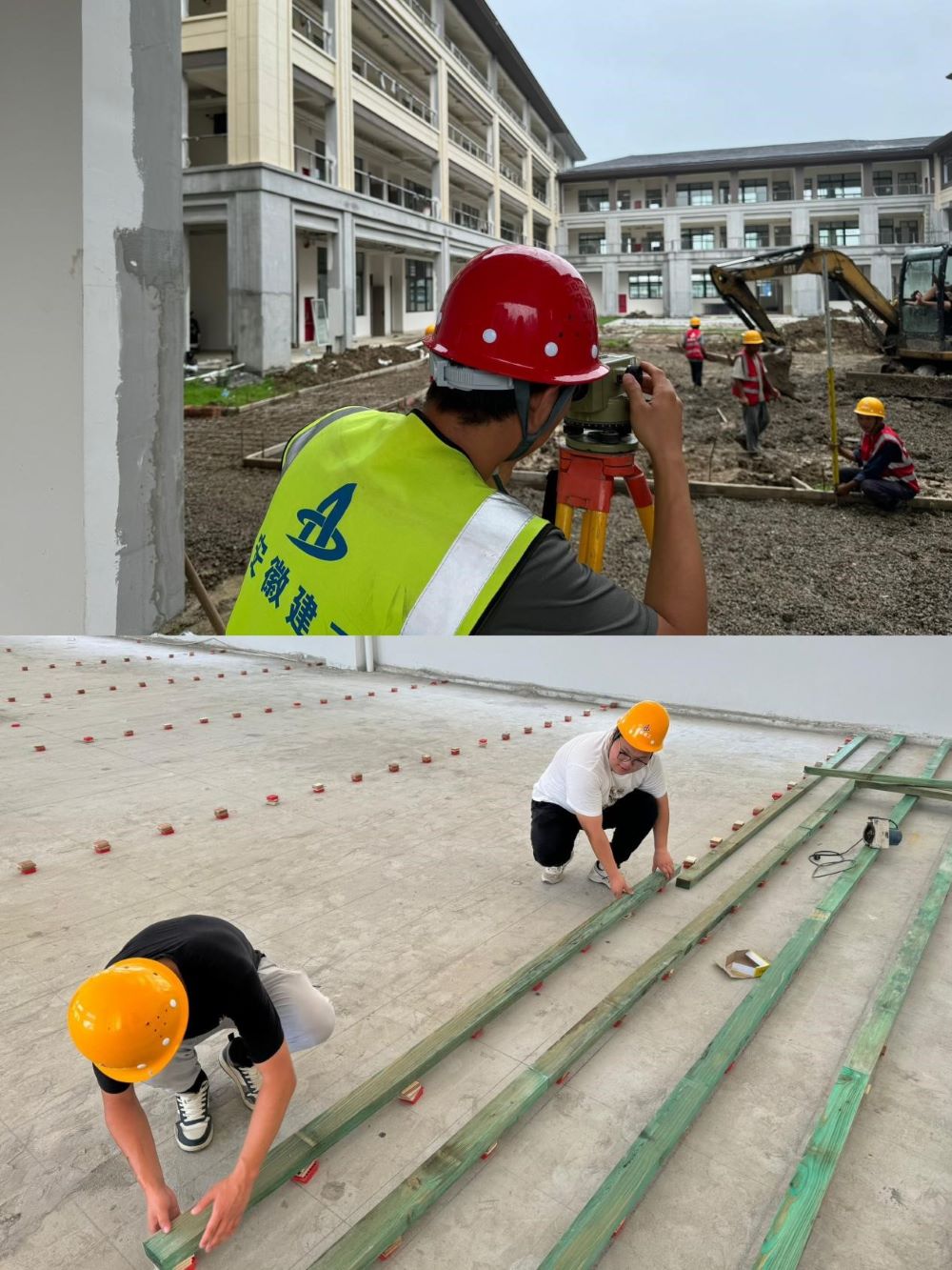 圖為4號樓內(nèi)庭院鋪裝基層碎石整平、室內(nèi)體育場運動木地板龍骨搭建