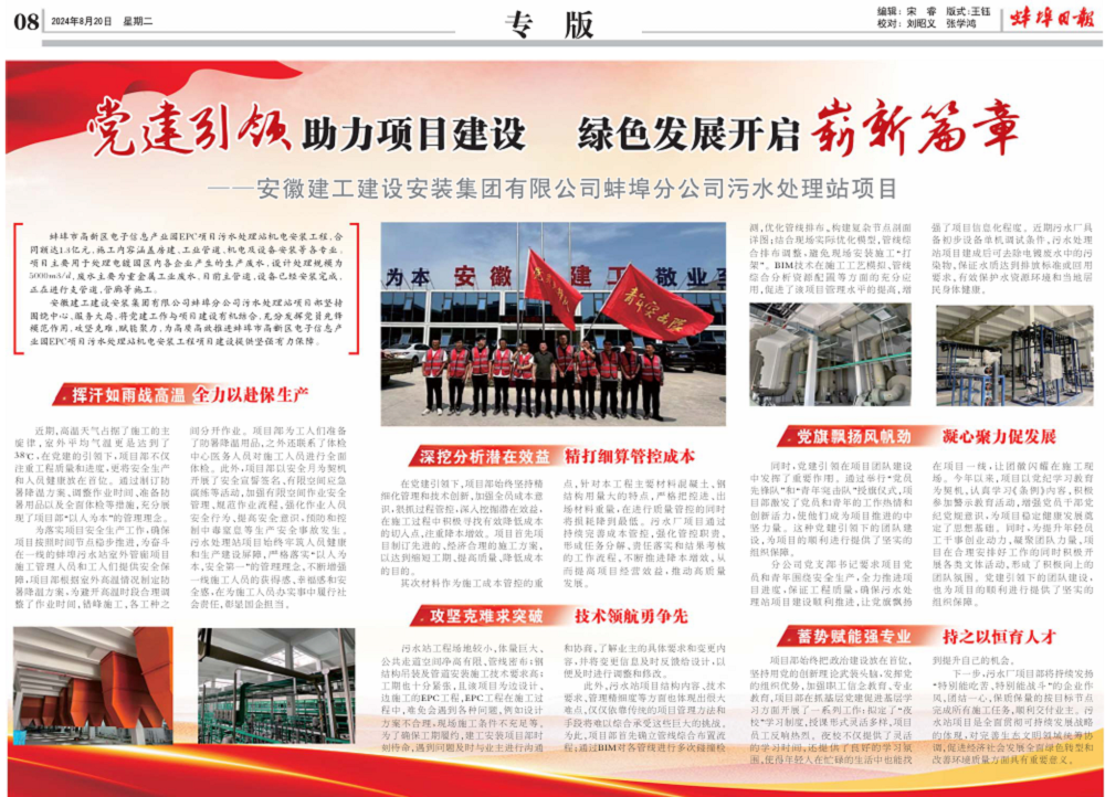 媒體專版報道了建工安裝蚌埠分公司高新區(qū)電子信息產(chǎn)業(yè)園EPC項目污水處理站機電安裝工程項目的基本概況,以及該項目抓黨建、保生產(chǎn)、降成本、強技術(shù)、育人才等方面的成功經(jīng)驗和做法。