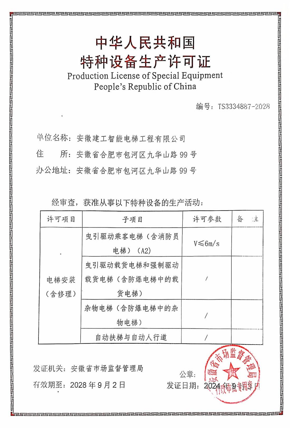 近日,經(jīng)安徽省市場監(jiān)督管理局核準,安徽建工智能電梯工程有限公司順利取得特種設備生產(chǎn)許可證,喜獲電梯安裝(含修理)A2級資質(zhì)。