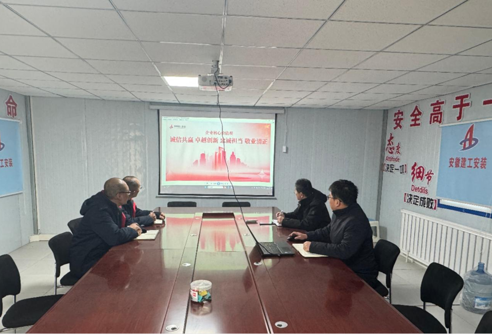 近日,建工安裝新疆烏蘇分公司召開(kāi)專(zhuān)題學(xué)習(xí)會(huì),傳達(dá)學(xué)習(xí)宣貫集團(tuán)核心價(jià)值觀,會(huì)議以現(xiàn)場(chǎng)+視頻方式召開(kāi),分公司黨支部書(shū)記、經(jīng)理李磊主持會(huì)議,分公司領(lǐng)導(dǎo)班子成員、機(jī)關(guān)及項(xiàng)目人員參加。