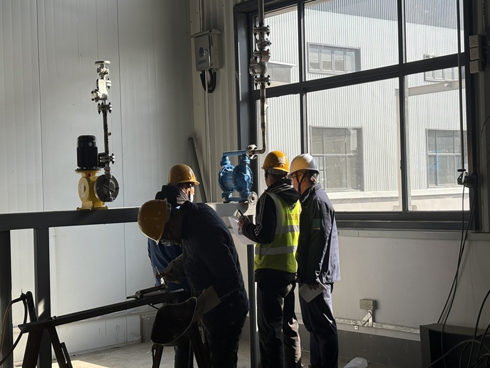 施工人員正在進(jìn)行圖紙核對及管道焊接